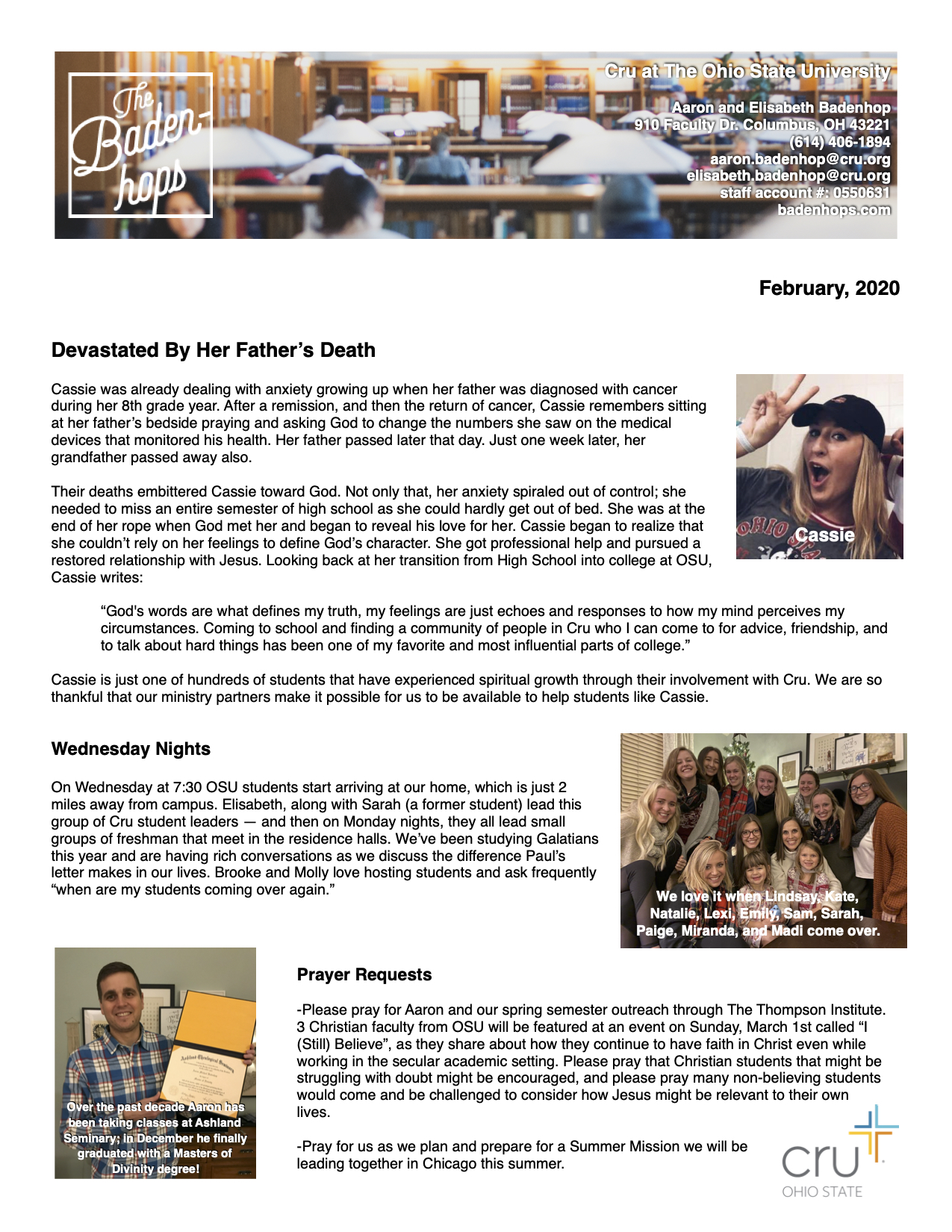 After twenty years on staff with Cru, Aaron and Elisabeth Badenhop are expanding their work through Global Service Associates. Aaron is founding a Christian study center on the doorstep of OSU, while Elisabeth develops her soul care ministry. Aaron received a Doctor of Ministry degree from Portland Seminary of George Fox University, is associate director of CMDA at OSU, and an elder at Hope Church. Elisabeth completed a 3-year soul care certification through Sustainable Faith. This site shares about our family and our work on campus. Thanks for visiting.